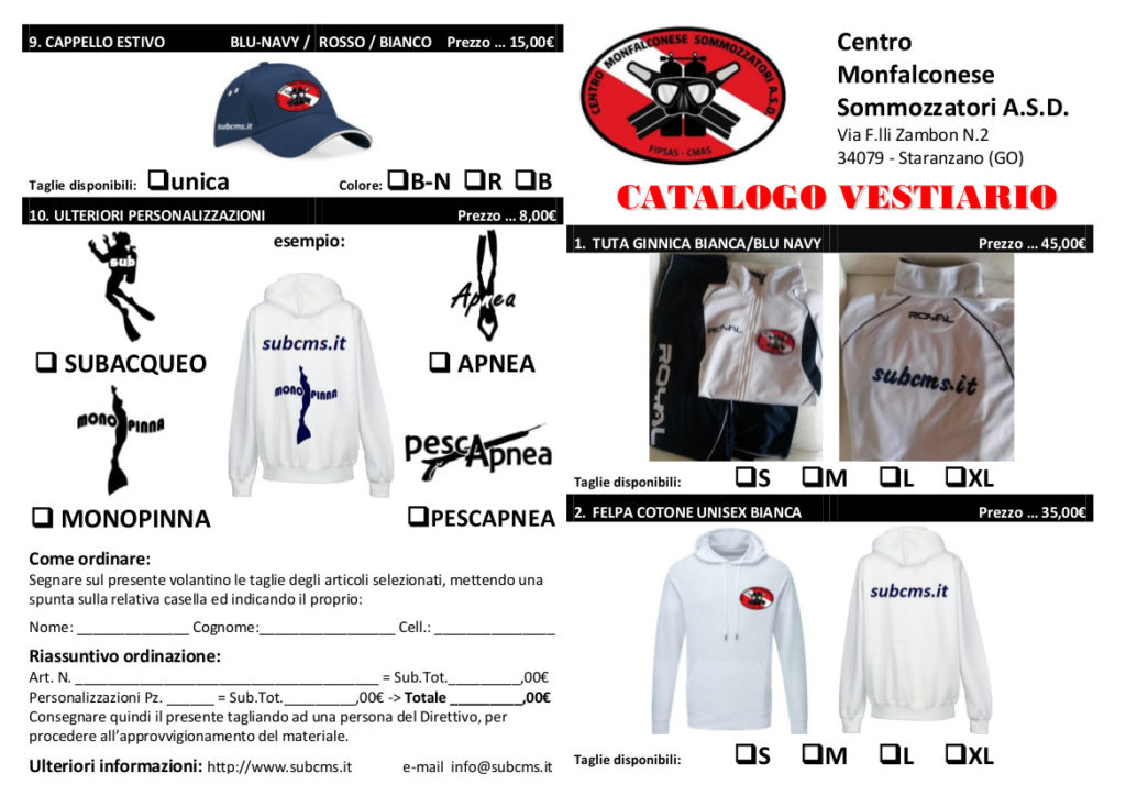 il club si è fatto la divisa! Da oggi se siete interessati potrete acquistare il vestiario ufficiale del nostro amato club. A disposizione troverete cappellini, tute, polo, boxer per l’estate e molto altro. Dovrete solo compilare questo modulo e inviarlo a info@subcms.it altrimenti lo potete consegnare a mano ad una persona del direttivo.